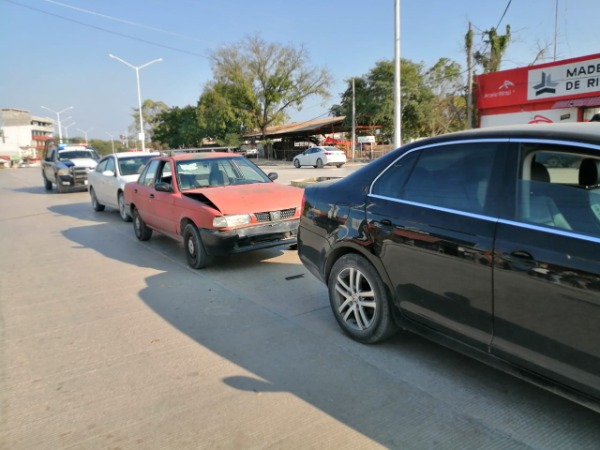 Un vehículo Nissan Tsuru chocó por alcance contra un Volkswagen Bora color negro, y el Tsuru fue impactado por un Nissan Máxima blanco.