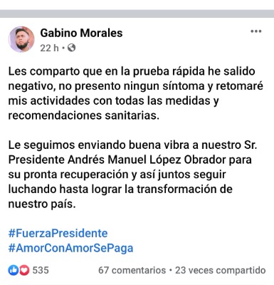 "Les comparto que en la prueba rápida e salido negativo, no presento ningún síntoma y retomaré mis actividades con todas las medidas y recomendaciones sanitarias. Le seguimos enviando buena vibra a nuestro señor presidente, Andrés Manuel López Obrador, para su pronta recuperación y así juntos seguir luchando hasta lograr la transformación de nuestro país", se lee en el mensaje publicado en sus redes sociales.