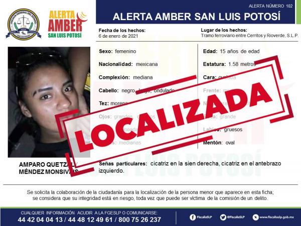 La Fiscalía General del Estado de San Luis Potosí (FGESLP), informa que la adolescente Amparo Quetzaly Méndez Monsiváis de 15 años de edad, quien contaba con una Alerta Amber, ya fue localizada sana y salva.