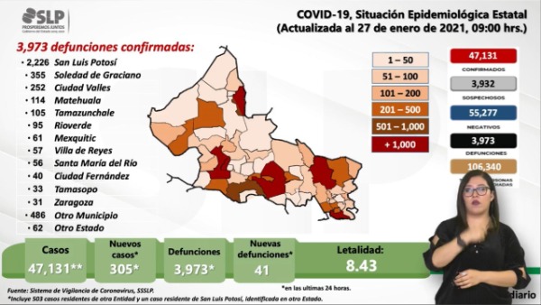 Fernando Hernández Maldonado, Subdirector de Epidemiología, presentó una cifra de 305 nuevos casos para llegar a 47,131 casos confirmados de 106,340 personas estudiadas, de las que se han descartado 55,277; la cifra de pendientes de estudio es de 3,932 sospechosos, y el número de lamentables decesos subió a 3,973 con un índice de letalidad subió a 8.43% decesos por cada 100