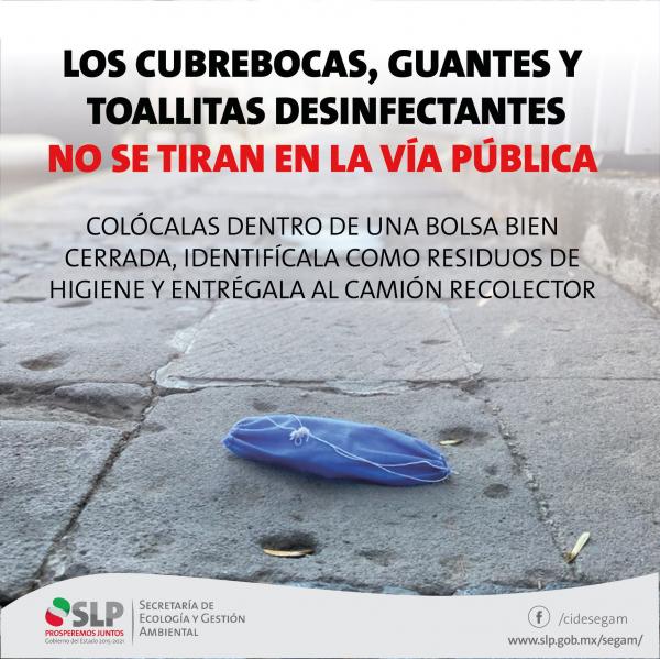 La funcionaria indicó que se deben cerrar y amarrar las bolsas de basura cuidadosamente, además de evitar tener contacto con el personal designado para su recolección. Los residuos como cubrebocas, papel higiénico, pañuelos desechables, toallas desinfectantes, toallas femeninas, guantes, cepillos dentales, objetos punzocortantes como navajas, rastrillos, jeringas y pedazos de vidrio, y otros residuos como colillas de cigarro, chicles, esponjas y trapos de limpieza, deberán envolverse en papel periódico y colocarse por separado. De preferencia, deberán ir identificados para su disposición.