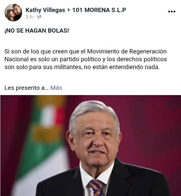 Villegas, expresa: "¡NO SE HAGAN BOLAS!, Si son de los que creen que el Movimiento de Regeneración Nacional es solo un partido político y los derechos políticos son solo para sus militantes, no están entendiendo nada.