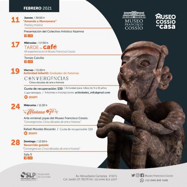 Con el objetivo de atender las medidas sanitarias para salvaguardar la salud de las y los potosinos, la Secretaría de Cultura de San Luis Potosí (SECULT), invita a participar en las actividades que el Museo Francisco Cossío realizará de forma virtual durante febrero, informó el titular de la dependencia, Armando Herrera Silva.