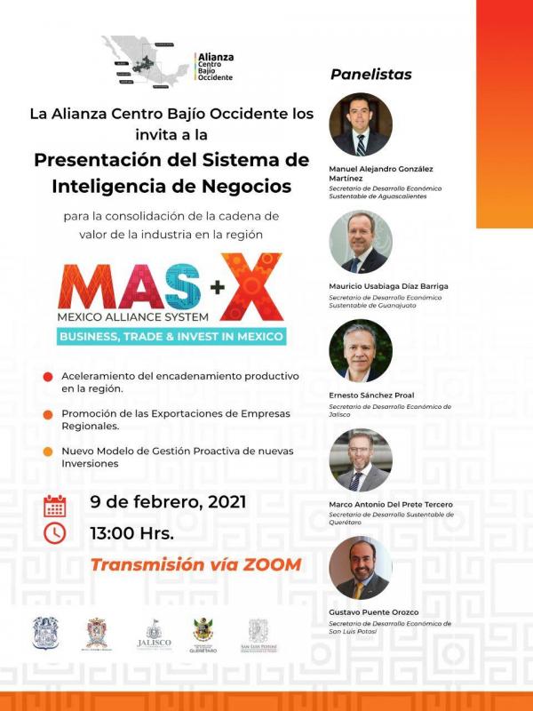 El Secretario de Desarrollo Económico (SEDECO), Gustavo Puente Orozco, dio a conocer que este 9 de febrero se llevará a cabo desde San Luis Potosí, la presentación vía zoom del Sistema Mexicano de Vinculación de Negocios MÁS MÉXICO, que impulsa la Alianza Centro Bajío Occidente (ACBO) y busca la vinculación de empresas de la región con grandes compradores de México y del mundo, para fortalecer la cadena de valor de la industria.