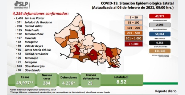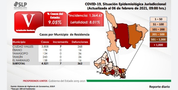 Ciudad Valles presenta al corte de este día un incremento de siete contagios para un total de 3 mil 808 pacientes y 268 víctimas mortales.