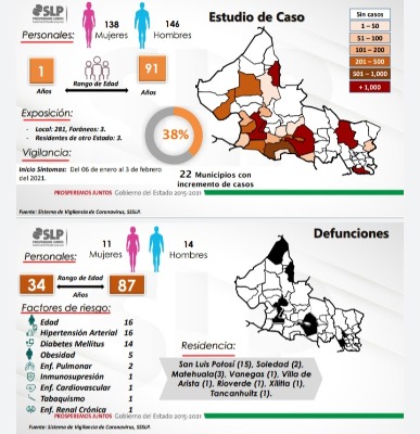 Sobre los nuevos 284 casos positivos a coronavirus, se detalló que se trata de 138 mujeres y 146 hombres, en un rango de edad de 1 a 91 años; mismos que tienen como residencia 196 en la capital; 39 en Soledad; siete en Matehuala; uno en Charcas y Villa de Guadalupe; cuatro en Mexquitic; dos en Santa María del Río, Villa de Reyes y en Zaragoza; uno en Villa de Arista, Tierta Nueva, Ahualulco, Salinas y Villa de Arriaga; ocho en Rioverde; dos en Ciudad Fernández; uno en San Ciro de Acosta , San Nicolás Tolentino y Villa Juárez; siete en Ciudad Valles; uno en Tamazunchale; uno en San Vicente Tancuayalab y tres foráneos.