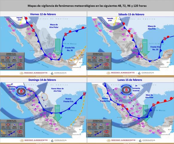 Finalmente, durante la mañana del sábado, el Frente Frío No. 35 se extenderá como estacionario y en proceso de disipación sobre el norte, oriente, centro y sureste del territorio nacional, ocasionando chubascos y lluvias fuertes sobre el noreste, oriente y sureste del país.