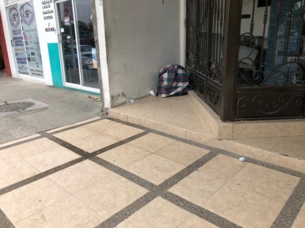 Una indigente en situación de calle pedía ayuda de la población consistente en un suéter y una cobija, pues se encontraba a la intemperie afuera de las oficinas de la representación del Gobierno del Estado, cuando se registra un frío intenso de alrededor de 5 grados centígrado.