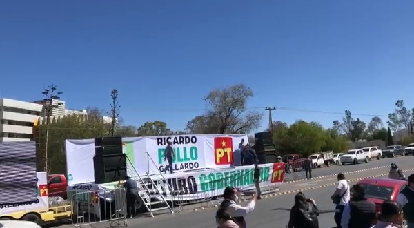 Previo al registro de Ricardo Gallardo Cardona Como candidato a la gubernatura de San Luis Potosí por la coalición Juntos Haremos Historia, integrada por el Partido del Trabajo y el Partido Verde Ecologista de México instalaron un escenario afuera del Ceepac.