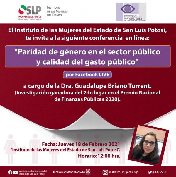 A través del Facebook Live del Instituto de las Mujeres de San Luis Potosí (IMES), se transmitirá la conferencia virtual "Paridad de género en el sector público y la calidad del gasto público", el próximo jueves 18 de febrero a las 12:00 horas, informó la titular de la dependencia Erika Velázquez Gutiérrez.