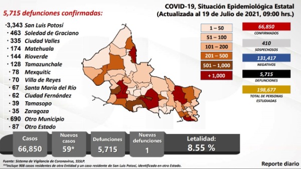 Este día se presentaron 59 nuevos casos para llegar a 66 mil 850 casos confirmados de 198 mil 677 personas estudiadas; se han descartado 131 mil 417 personas y la cifra de pendientes de estudio es de 410 sospechosas. Los decesos subieron a 5 mil 715 con un índice de letalidad que continúa bajando, este día con 8.55 decesos por cada 100 casos.