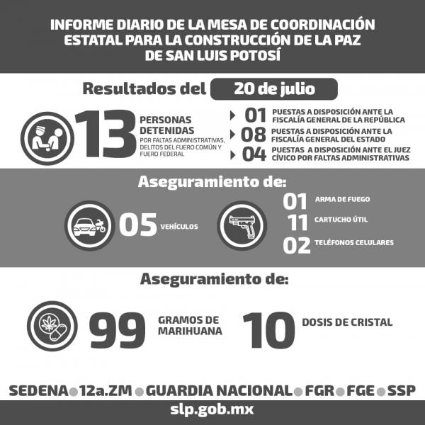 En materia de detenciones, 13 personas fueron puestas a disposición de las autoridades correspondientes, por diversos delitos y faltas; quedando una ante la Fiscalía General de la República; 8 a disposición de la Fiscalía General del Estado; y 5 puestas a disposición del juez cívico por faltas administrativas.En Ciudad Valles, elementos de la Policía Estatal realizaron la detención de Eduardo "N" por la portación de un arma de fuego, tipo escuadra, modelo 92SM, calibre 9 milímetros y un cargador con 11 cartuchos útiles, asegurándole una camioneta marca Chevrolet, tipo Silverado, de color gris, modelo 2001.