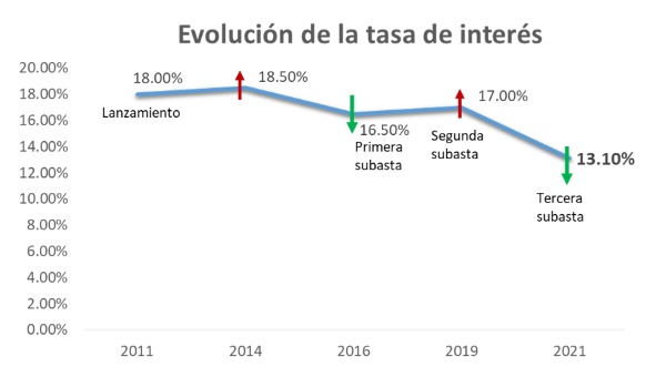 A mediados de 2011, este financiamiento se lanzó con una tasa de 18%, la cual se ha ido ajustando con el paso del tiempo hasta alcanzar su nivel más bajo en esta tercera subasta, con la asignación de recursos a cuatro instituciones bancarias para poder otorgar crédito a las personas derechohabientes del Instituto.