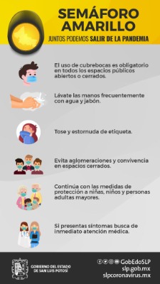 Derivado del cambio de semáforo a color amarillo para San Luis Potosí, la Secretaría de Salud del Estado, informó que los aforos permitidos para diversas actividades cambiaron por lo que emitió una serie de recomendaciones que deberán observarse durante los próximos quince días.