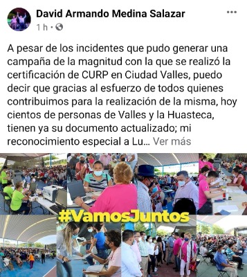 El alcalde electo de este municipio, David Armando Medina Salazar, reconoció el esfuerzo de la Dirección del Registro Civil del Estado, así como también al presidente municipal interino, Jorge Farías Castro, al llevar a cabo la Jornada de Certificación de la CURP, que tuvo una duración de tres días.