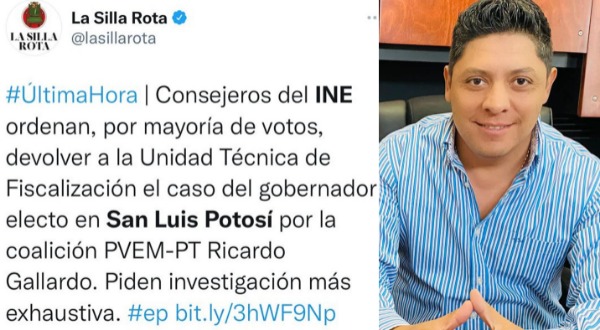 El Consejo General del Instituto Nacional Electoral (INE) ordenó devolver a la Unidad Técnica de Fiscalización (UTF), el expediente conformado en materia de fiscalización se sigue a Ricardo Gallardo Cardona, gobernador electo de San Luis Potosí, bajo las siglas del PVEM-PT, de acuerdo a la información publicada esta tarde en el portal informativo La Silla Rota, decisión, que se tomó en la sesión del Consejo efectuada este día.