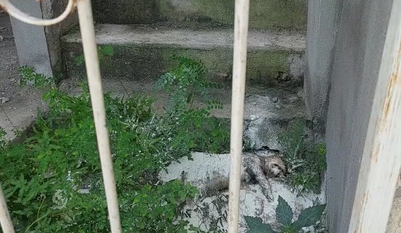Asimismo, a cinco metros aproximadamente del gato, se encuentra amarrado con una cadena un perro, el cual, también tiene que soportar los olores fétidos que despide el cuerpo del animal en descomposición.