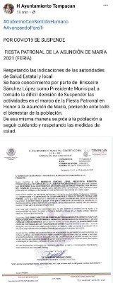 Se hace conocimiento por parte de Brisseire Sánchez López como Presidente Municipal, a tomado la difícil decisión de Suspender las actividades en el marco de la Fiesta Patronal en Honor a la Asunción de María, poniendo ante todo el bienestar de la población.