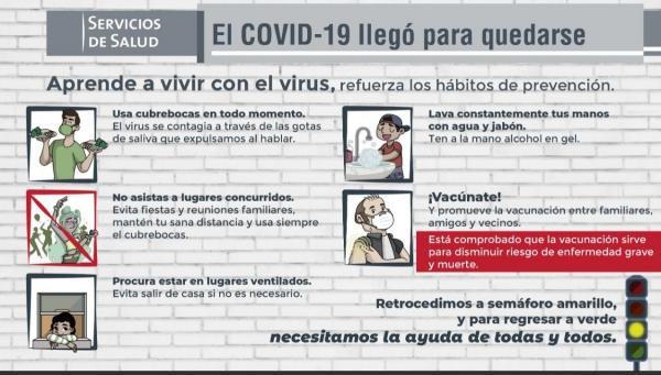 Por lo que se reiteró la importancia del uso obligatorio de cubrebocas en espacios abiertos y cerrados; el lavado y desinfección de manos; evitar lugares con aglomeraciones, ya sean públicos o privados: no llevar a cabo fiestas o reuniones y, ante todo, respetar las indicaciones de establecimientos y de las autoridades de salud, son las medidas que de forma instantánea deben aplicarse para contrarrestar el avance del virus.
