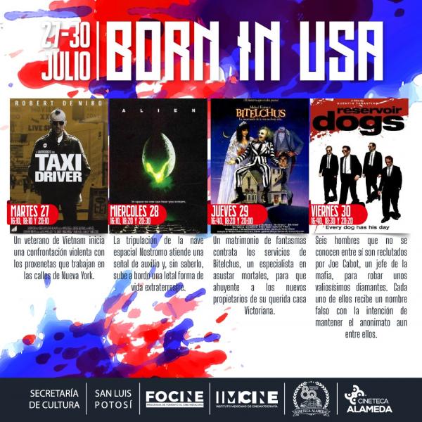 La Secretaría de Cultura de San Luis Potosí (SECULT) invita al ciclo de cine "Born in USA", en el que se proyectarán largometrajes como "Taxi Driver", "Beetlejuice" y "Perros de reserva", del 27 al 30 de julio en la Cineteca Alameda.