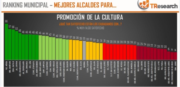 En un ejercicio para conocer la opinión ciudadana sobre diversas variables de preferencia y percepción, respecto a las estrategias de difusión de la Cultura por parte de 51 administraciones municipales de todo el país, la capital potosina se ubicó por debajo de la media, quedando a deber a los ciudadanos en este aspecto, de acuerdo a lo revelado por la casa encuestadora TResearch.