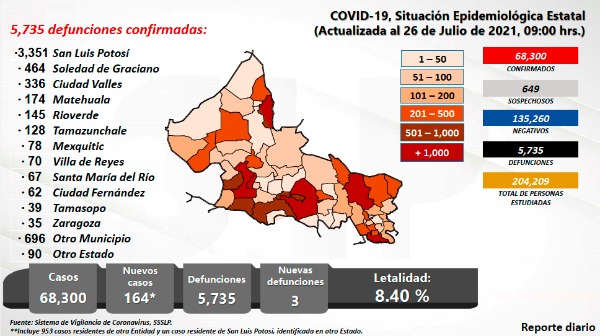 Este día se presentaron 164 nuevos casos para llegar a 68 mil 300 confirmados de 204 mil 209 personas estudiadas; se han descartado 135 mil 260 personas y la cifra de pendientes de estudio es de 749 sospechosos. Los decesos subieron a 5 mil 735 con un índice de letalidad que continúa bajando, este día con un 8.40% decesos por cada 100 casos.