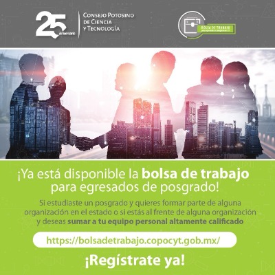Con el fin de ofrecer opciones laborales para las y los egresados de posgrado, el Consejo Potosino de Ciencia y Tecnología (COPOCYT), cuenta con bolsa de trabajo virtual, misma que puede ser consultada a través de su sitio web oficial.