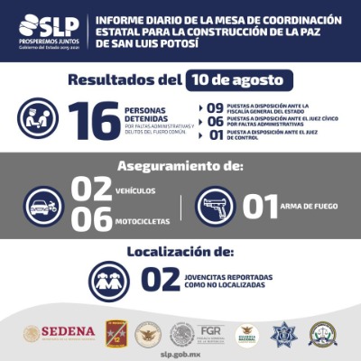Se detalla que fueron consignadas 16 personas y puestas a disposición de las autoridades correspondientes. En esta ocasión, 9 quedaron a disposición de la Fiscalía General del Estado, 6 presentadas ante el juez de control y una más ante el juez cívico por faltas administrativas.
