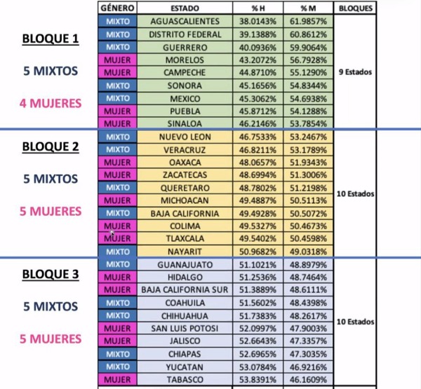 En el caso de la paridad vertical, se aprueba que en todos los casos Presidencia y Secretaría recaiga en género distinto. Y en la horizontal se reservan los estados de Morelos, Campeche, Puebla, Sinaloa, Oaxaca, Zacatecas, Michoacán, Colima, Tlaxcala, Hidalgo, Baja California Sur, San Luis Potosí, Jalisco y Tabasco, a fin de que el registro de candidaturas a la Presidencia, únicamente puedan contender personas de género femenino.