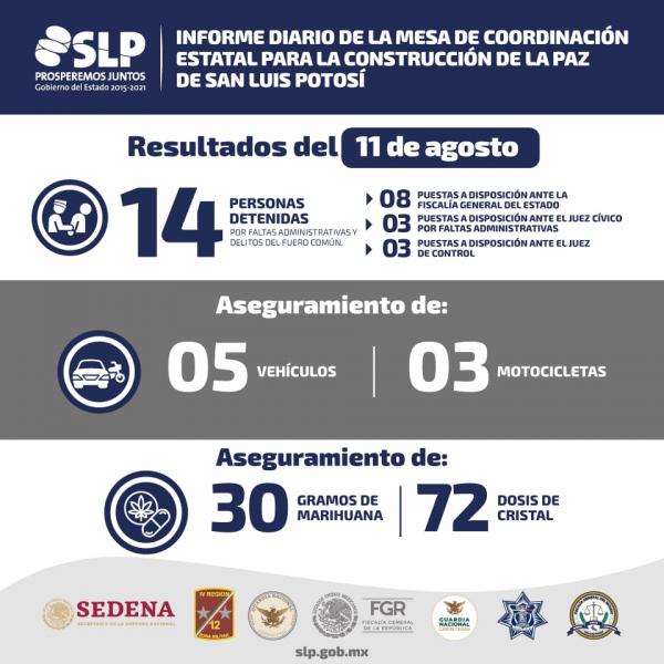 Derivado de las acciones y operativos realizados en San Luis Potosí de manera conjunta entre las corporaciones de seguridad y procuración de justicia, la Mesa Estatal para la Construcción de la Paz dio a conocer la detención de 14 personas este miércoles por diversos delitos.