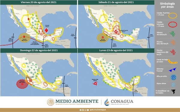Durante el sábado el ciclón tropical Grace, recorrerá el centro del país debilitándose gradualmente, se pronostica que interactúe con la Onda Tropical No. 22, la cual recorrerá el occidente del territorio nacional y una zona de baja presión con probabilidad para desarrollo ciclónico frente a las costas de Colima y Jalisco, ocasionarán lluvias fuertes a puntuales intensas sobre entidades del oriente, centro, occidente y sur de México, con lluvias puntuales torrenciales en Guerrero y Michoacán.