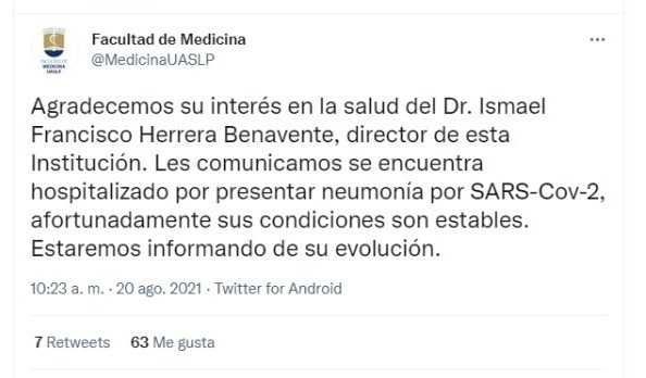 "Agradecemos su interés en la salud del Dr. Ismael Francisco Herrera Benavente, director de esta Institución. Les comunicamos se encuentra hospitalizado por presentar neumonía por SARS-Cov-2, afortunadamente sus condiciones son estables. Estaremos informando de su evolución".