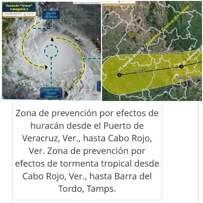 El Servicio Meteorológico Nacional, informó hace unos momentos, que el Huracán Grace, ha pasado de Categoría 1, a 2, en la escala de Saffir-Simpson, por lo que se esperan fuertes vientos y lluvias, principalmente en la Costa de Veracruz, donde estará golpeando este próximo 21 de agosto, alrededor de las 7 de la tarde.