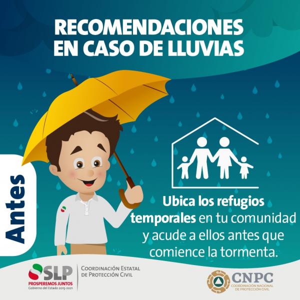 Además, dijo que en caso de haber sido evacuados, evitar regresar a casa hasta que lo indiquen las autoridades; en caso de inundación, no tocar cables eléctricos que hayan caído y reportar de inmediato a los teléfonos de emergencia; extremar precaución en caminos serranos ante la posibilidad de deslaves; si resulta una persona herida, reportarlo y no tratar de moverlos; una vez que pase la tormenta limpiar la casa y desinfectar los depósitos de agua con cloro.