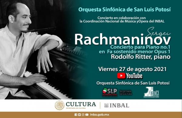 Como parte de la programación virtual #CulturaVivaEnCasa, la Secretaría de Cultura de San Luis Potosí (SECULT) presenta el concierto de la Orquesta Sinfónica de San Luis (OSSLP) este viernes 27 de agosto en su canal de YouTube: bit.ly/3pEL7nV, recordando la más reciente participación del pianista Rodolfo Ritter que interpretó el Primer Concierto para Piano de Sergéi Rachmaninov, el pasado mes de julio en el Teatro de la Paz, y que se realizó en coordinación con la Coordinación Nacional de Música y Ópera del INBAL.