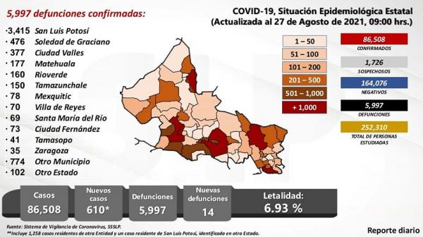 Este día se reportan 610 contagios y 13 fallecimientos. La letalidad en San Luis Potosí sigue a la baja con 6.93% casos por cada 100.