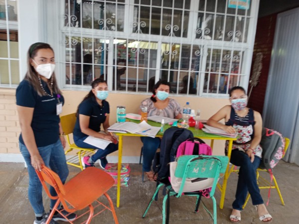 Un grupo de personal de la Unidad de Servicios de Apoyo a la Educación Regular, integrado por cuatro personas, entre ellas una psicóloga, una trabajadora social, una comunicadora y demás, se encuentran en la escuela primaria "Narciso Mendoza" de la colonia 20 de Noviembre, para apoyar y fortalecer las actividades educativas en el regreso a clases presenciales que se dio a partir de hoy, al ponerse en marcha el presente ciclo escolar 2021-2022.
