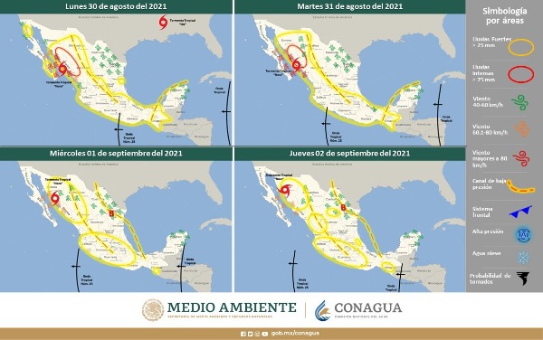 Para hoy, los remanentes de Nora se mantendrán sobre el noroeste de México, originando condiciones para lluvias muy fuertes a intensas y vientos fuertes, además de lluvias puntuales torrenciales en Sinaloa.