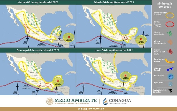 Durante el periodo del pronóstico dos canales de baja presión en interacción con inestabilidad atmosférica superior continuarán afectando el noroeste, norte, noreste, occidente, centro y oriente de la República Mexicana, ocasionando chubascos y lluvias fuertes a muy fuertes acompañadas de descargas eléctricas y posibles granizadas.