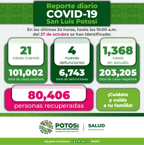 La Secretaría de Salud de San Luis Potosí y el Comité Estatal para la Seguridad en Salud, informan que, hasta este miércoles 27 de octubre, se registran 101 mil 0021 casos totales de Covid-19, con la confirmación de 21 nuevos contagios de acuerdo al reporte epidemiológico de las últimas 24 horas.