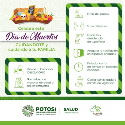 Con la instrucción del Gobernador Ricardo Gallardo Cardona, en el marco de la celebración del Día de Muertos, con el procedente de tratarse de una las tradiciones más importantes de San Luis Potosí, la Comisión Estatal para la Protección Contra Riesgos Sanitarios realiza trabajo coordinado con las 58 presidencias municipales para que durante los días de festividades se realicen actividades garantizando para la población el cumplimiento de los protocolos establecidos y que actualmente nos rigen dentro del Semáforo Epidemiológico color Verde.