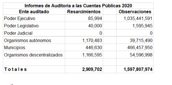 Monto global de las observaciones a las Cuentas Públicas del ejercicio 2019: 928,604,000 pesos.