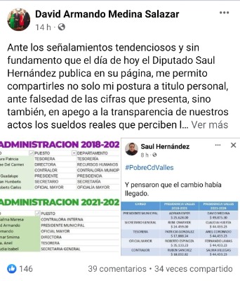 Muy molesto con el diputado Saúl Hernández, el Presidente Municipal, David Medina Salazar, hace una publicación en su perfil social y lo somete al juicio de sus parásitos digitales, quienes de inmediato reaccionan a su favor en el tema de los elevados salarios que evidencia el legislador percibe el alcalde y sus principales colaboradores, muy superiores a los de la pasada administración.
