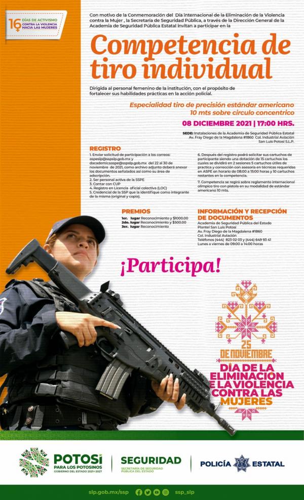 Con motivo de la conmemoración del "Día Internacional de eliminación de la violencia contra la mujer", la Secretaría de Seguridad Pública del Estado convoca a su "Competencia de tiro individual", dirigida al personal femenino de la institución, con el propósito de fortalecer sus habilidades prácticas en la acción policial.