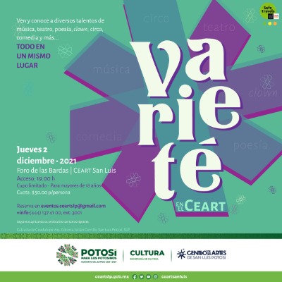 Inmerso en las acciones de divulgación artística y cultural promovidas por el Gobierno del Estado, encabezado por José Ricardo Gallardo Cardona, y la Secretaría de Cultura a través del Centro de las Artes de San Luis Potosí, se llevará a cabo la segunda edición de la Varieté en el Ceart, evento a realizarse este jueves 02 de diciembre 2021, en punto de las 19:00 h., en el patio de las bardas del Ceart.