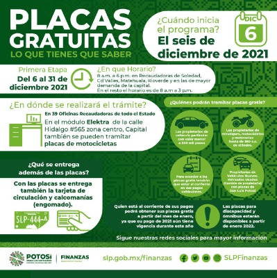 El día lunes 6 de diciembre, arranca el programa "Placas Gratuitas" que impulsa el Gobernador del Estado Ricardo Gallardo Cardona, con la finalidad de apoyar a las familias potosinas y como parte de las acciones del combate a la corrupción. Un compromiso más cumplido dentro de los primeros 100 días de Gobierno.