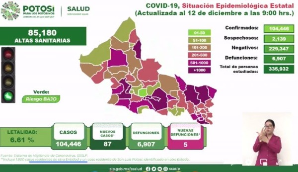 El Comité estatal, para la Seguridad en Salud, informó que diariamente hay un promedio de casos nuevos entre 87 y 100 por día, las defunciones no se han podido disminuir a cero, al contrario, se tiene una discreta señal a incrementarse.