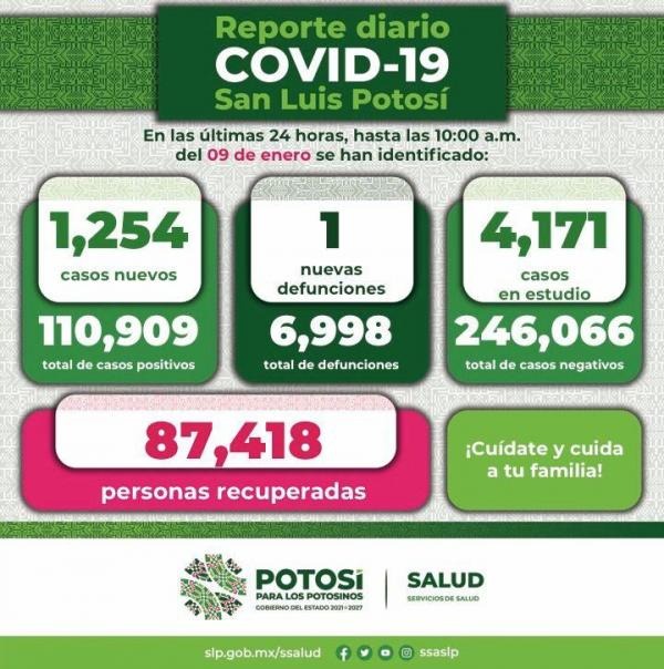 Retomando el reporte Covid-19 diario, hasta este domingo 9 de enero, se registran 110 mil 909 casos totales, con la confirmación de mil 254 nuevos contagios en las últimas 24 horas.