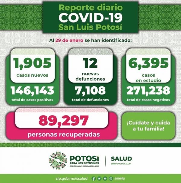 En cuanto al Informe Diario de casos Covid-19, se dan a conocer 1 mil 905 nuevos contagios confirmados en la entidad potosina. De esta forma y con la estadística mencionada, el Comité Estatal para la Seguridad en Salud y los Servicios de Salud, informan que, hasta este día se registran 146 mil 143 casos totales de Covid-19.