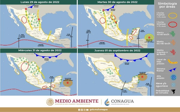 Condiciones generadas por el monzón mexicano que prevalecerá sobre el noroeste del territorio nacional, canales de baja presión en el interior del país y la vertiente del Golfo de México, divergencia en altura, aunado al ingreso de humedad del Océano Pacífico, Golfo de México y Mar Caribe, así como una onda tropical que se aproximará a la Península de Yucatán y recorrerá el sureste mexicano.